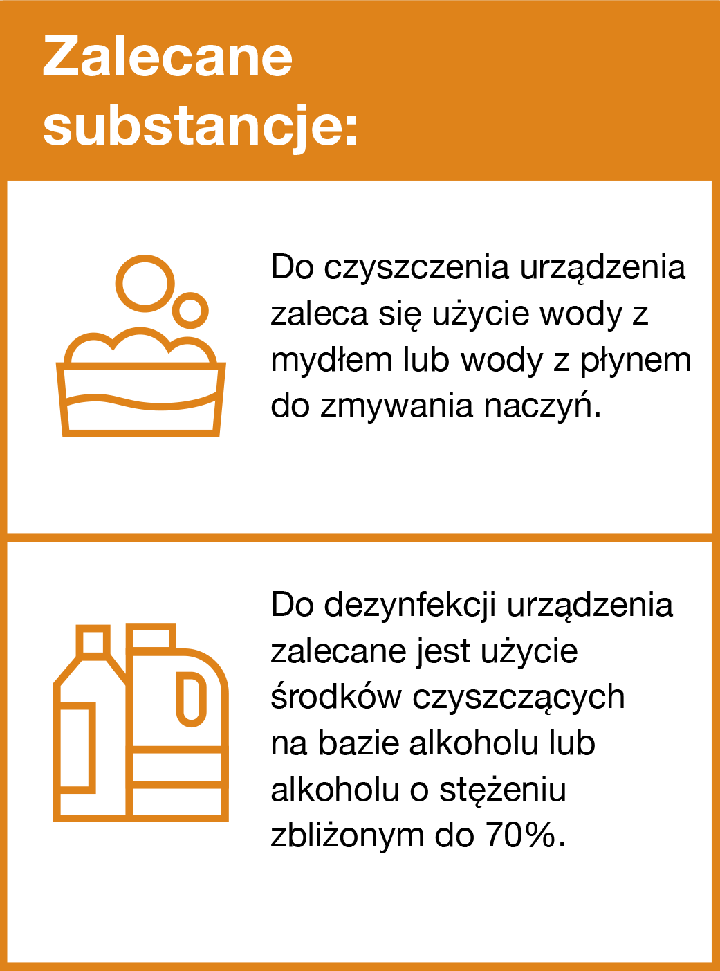 - Do dezynfekcji: środki czyszczące na bazie alkoholu lub alkohol o stężeniu zbliżonym do 70%