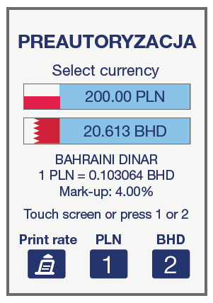Na ekranie wyświetlane są również flagi państw, służące zobrazowaniu obu walut: waluty lokalnej i rodzimej waluty posiadacza karty.